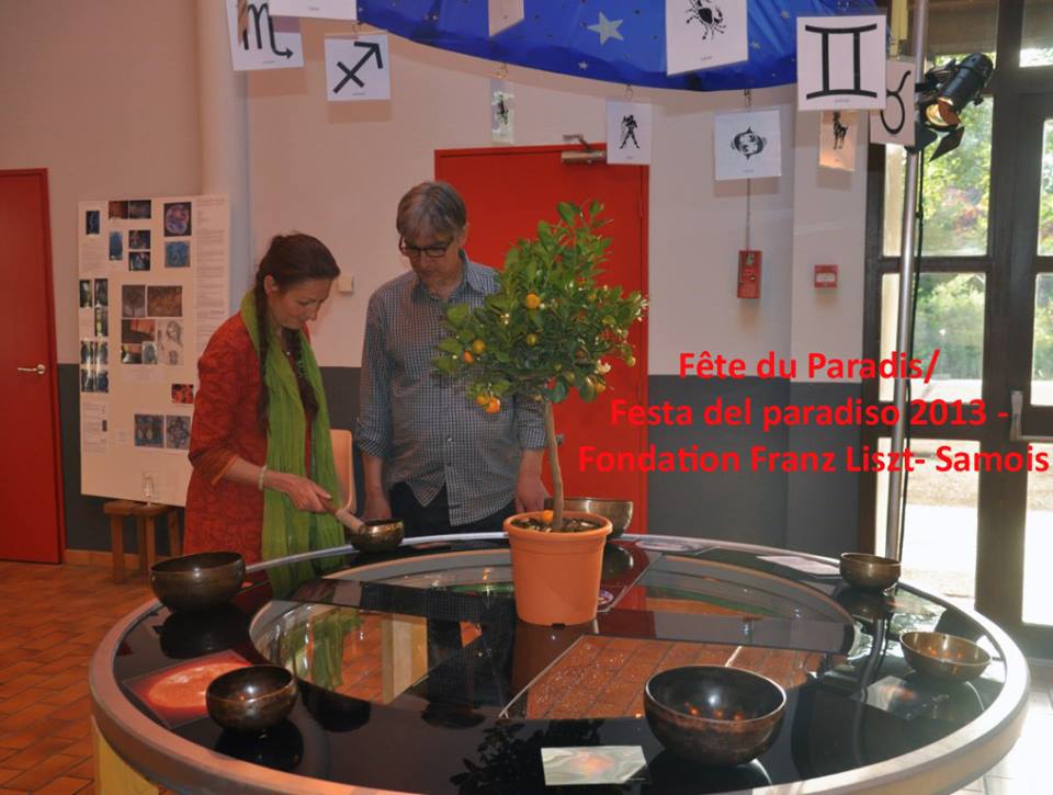 « L’arbre de vie » au milieu du « jardin du paradis » avec les sept planètes tout autour (bols tibétains accordés selon les sept notes de la gamme)