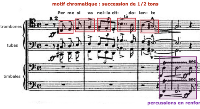 , procédé que Liszt emprunte au plain-chant grégorien. Exposé par les trombones, le tuba et les cordes graves, auxquels vont répondre les cors et trompettes, ce motif essentiellement chromatique (qui procède par demi-tons successifs) figure un enfer aussi fantastique que démoniaque, à grands renforts de percussions, de gigantesques contrastes de nuances et d’effets descriptifs quasi bruitistes.