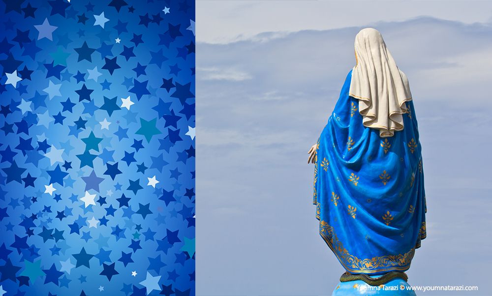 Dans la tradition chrétienne, le bleu est associé à la vertu de la foi et dont la Vierge Marie en est l’archétype ultime. Si elle ainsi souvent recouverte de vêtements bleus c’est parce quelle s’est d’abord faite matrice du projet de Dieu, ayant vécu son « oui » comme un moment de contact, d’adhésion, d’ouverture, d’abandon où le corps vibre, le cœur vibre, l’intelligence vibre. Paul Evdokimov écrit : « la foi est la réciprocité de deux faits, de deux oui, la rencontre de l’amour descendant de Dieu et de l’amour ascendant de l’homme. » Marie, en répondant à l’annonce de l’archange Gabriel : « que ta volonté soit faite » , devient ainsi l’archétype de la nature humaine qui, se plaçant à l’écoute de Dieu, adhère au projet eschatologique qu’Il lui propose, un projet qui bouleverse totalement son existence.