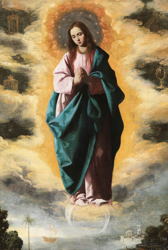 La tendre figure de jeune fille qu’offre à nos regards le peintre espagnol de la Contre-Réforme Francesco de Zurbaran, recèle bien des surprises. Que signifient ces éléments disséminés dans les nuages du ciel (Une étoile, une tour, une porte, un escalier, un miroir…) et le tranquille paysage sous ses pieds ?