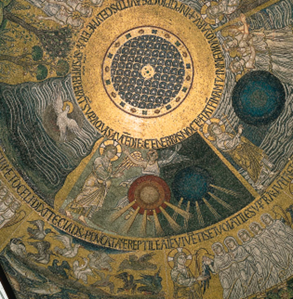 L’atrium de la basilique Saint-Marc, à Venise, est orné d’un splendide cycle de mosaïques relatant les événements racontés dans la Genèse. Les scènes relatives au récit de la Création, sous la première coupole, furent probablement achevées vers 1220. Les illustrations sont calquées sur les miniatures de la Bible de Cotton, manuscrit grec écrit et enluminé au Ve ou au VIe siècle. Ce détail montre la création du firmament par un démiurge jeune et imberbe.
