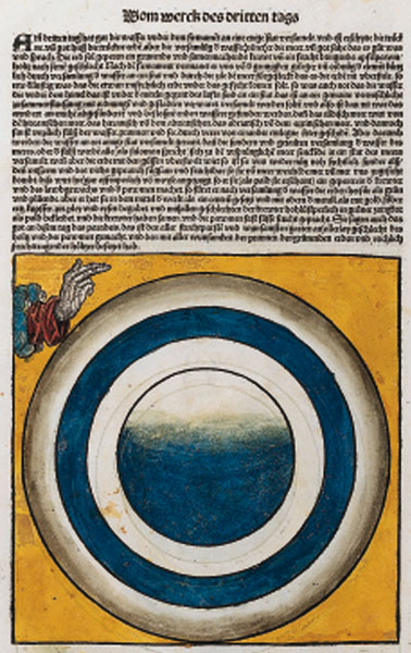 La main de Dieu réunit les eaux sous le firmament en un lieu, de sorte que la terre sèche peut apparaître, le monde étant dès lors divisé entre la terre et les mers. Jusqu’ici, la terre, l’eau et les autres éléments étant encore mêlés en un chaos, le nombre de sphères figurées dans les diagrammes est indéterminé – deux, cinq ou quatre selon la fantaisie de l’illustrateur, dont la tâche consiste à montrer l’invisible.