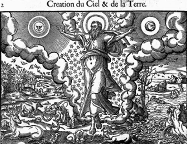 1401, pages 2 et 3 La légende de la gravure [p. 2] dit : « Création du Ciel et de la Terre, des Arbres, et Herbes, des Astres et de tous les Animaux ». La scène résume ainsi en un seul tableau les cinq premiers jours de la Création. Dieu le Père crée les luminaires au milieu des étoiles et des nuées ; au-dessous, les animaux terrestres sont à gauche, les créatures de l’eau à droite.