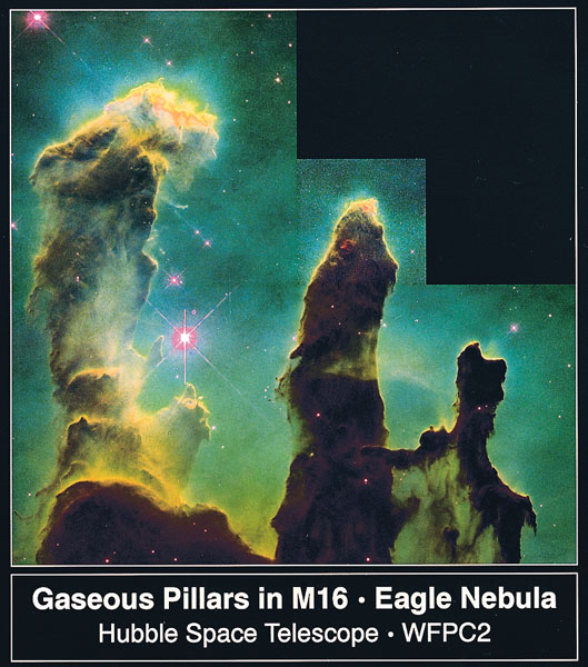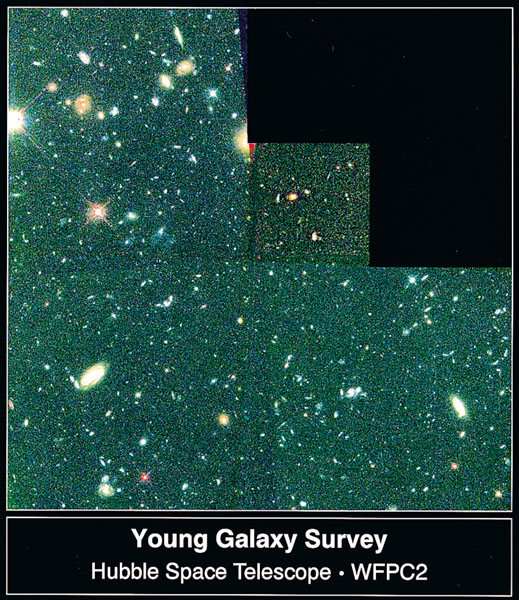 Ces images prises par le télescope Hubble en 1996 révèlent ce qui pourrait être les « briques de construction » des galaxies dans l’Univers primitif. Prises avec la Wide Field Planetary Camera 2, elles montrent un regroupement de dix-huit amas d’étoiles géants d’environ 2 000 années-lumière de diamètre, suffisamment proches l’un de l’autre (2 millions d’années-lumière) pour qu’ils finissent par fusionner et former un objet de la taille d’une galaxie. Situés à 11 milliards d’années-lumière, ils datent donc d’une époque où l’on croit que les premières galaxies se sont formées. Ce résultat ajoute du poids à la théorie de formation des galaxies selon laquelle ces dernières se constituent par regroupements d’amas d’étoiles, et non par fragmentation d’un vaste nuage protogalactique.