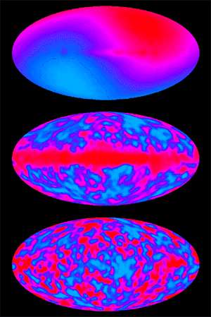 La « carte cobe » représente l’état de l’Univers jeune d’un million d’années, à l’époque où il n’était qu’une soupe extraordinairement lisse et homogène. Aucune structure astronomique de type étoile, galaxie, planète, n’existait. Seuls de très légers frissonnements agitaient la soupe. En effet, la carte cobe exhibe de minuscules inhomogénéités de température (codées par des couleurs). Toutefois, l’écart entre la région la plus chaude et la région la plus froide n’est que d’un cent millième de degré. Ces variations sont liées à des variations de densité : les régions les plus froides sont aussi les moins denses. On voit donc là l’origine de toutes les structures astronomiques, en quelque sorte les fœtus de galaxies !