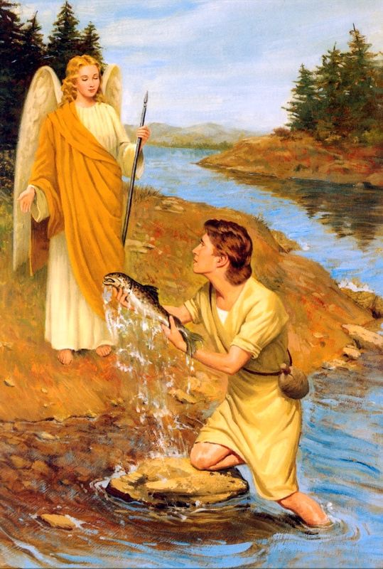 « Et il sortit pour se laver les pieds, et voici qu’un énorme poisson s’avança pour le dévorer. Tobie, plein d’effroi, jeta un grand cri, en disant : Seigneur, il va se jeter sur moi. Et l’ange lui dit : Prends-le par les ouïes, et tire-le à toi. Ce qu’ayant fait, il le tira à terre, et le poisson commença à se débattre à ses pieds. Alors l’ange lui dit : Vide ce poisson, et prends-en le cœur, le fiel et le foie, car ils te seront nécessaires pour des remèdes utiles. Ce qu’ayant fait, il fit rôtir une partie de la chair, qu’ils emportèrent avec eux en chemin ; ils salèrent le reste, qui leur devait suffire jusqu’à ce qu’ils arrivassent à Ragès, ville des Mèdes »