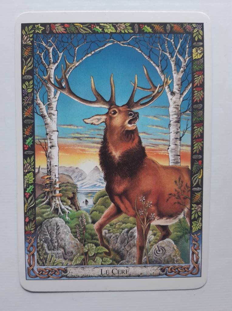La carte du cerf représente l’animal, bramant devant une arche de bouleaux. Dans la tradition druidique, le bouleau est l’arbre des commencements, et le cerf l’une des créatures vivant depuis le début des temps. L’arche représente le point de transition entre ce monde et l’au-delà, dont le cerf est : souvent considéré comme l’un des messagers. Près du cerf, on voit gravé sur un rocher la silhouette d’un homme portant une ramure, représentation du dieu Cernunnos, d’Herne-le-Chasseur, ou de Merlin. Au premier plan poussent des plantes associées à l’animal : le tabouret des champs (herbe potagère du cerf), l’oseille sauvage (oseille du cerf), l’asperge commune (poireau du fils du cerf).