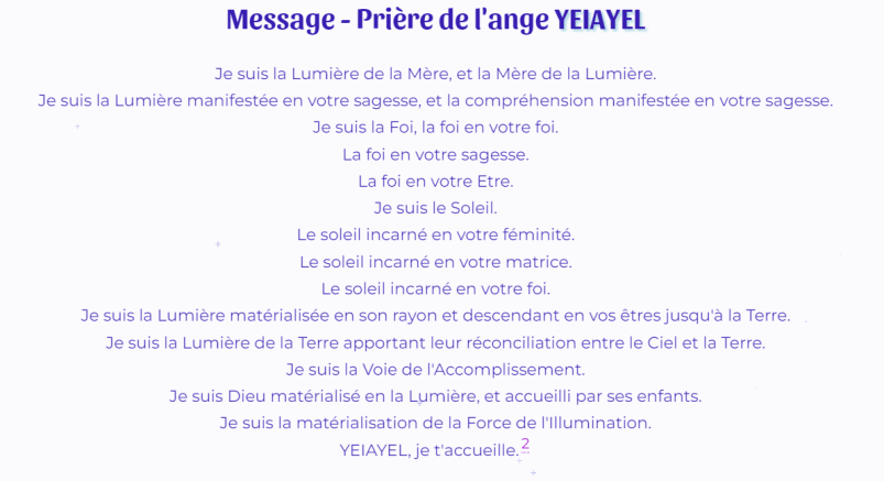 Yeiayel est donc une Force qui pousse l’individu qui le prie à agir de façon idéale, motivé par une exigence Supérieure, intérieure, qui amène à Transcender sa propre nature pour se manifester de façon Élevée, Unitaire, Admirable… par la promotion de l’Art, de la Science, de la Spiritualité… ou l’un, ou l’autre, et, plus sûrement, les 3 à la fois…