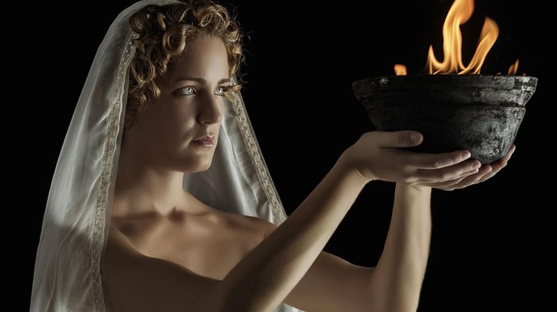 Hestia est la première née des six enfants du Titan Cronos, mais la dernière régurgitée. Sa fonction est de veiller sur le feu sacré. Aussi est-elle la déesse du foyer, ou plus précisément de l’âtre, toujours situé au centre de la maison dans la Grèce antique. Dans chaque famille, c’est elle qu’on honore et invoque en tout premier dans les rituels.