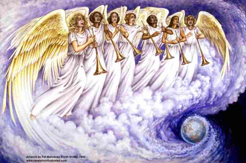 Revenons donc sur l’Apocalypse. Jean nous dit : « J’entendis la voix d’une multitude d’Anges rassemblés autour du trône, des Vivants et des Vieillards – ils se comptaient par myriades de myriades et par milliers de milliers ! » (Apocalypse V, 11) Le trône de Dieu est donc entouré de milliers d’Anges… Cependant, une autre précision est faite à propos des Anges ! Il y en a SEPT qui se tiennent, non pas autour du trône de Dieu, mais DEVANT Dieu : « Et je vis les sept Anges qui se tiennent devant Dieu ; on leur remit sept trompettes ». (Apocalypse VIII, 2) Il est évident donc que les sept Anges qui se tiennent devant DEVANT Dieu ont une position privilégiée que les autres anges ! Puisque ce sont les Anges aux sept trompettes, nous déduisons que ce sont les archanges, car saint Paul précise qu’au son de la trompette (ce doit être la septième), ce sera un signal donné par l’archange.
