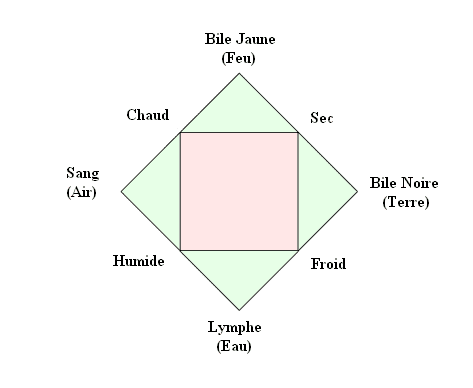 Le médecin sicilien Philistion, contemporain de Platon, répartit les quatre qualités entre les quatre éléments4 : le Feu est chaud, l’Air est froid, l’Eau est humide, la Terre est sèche.