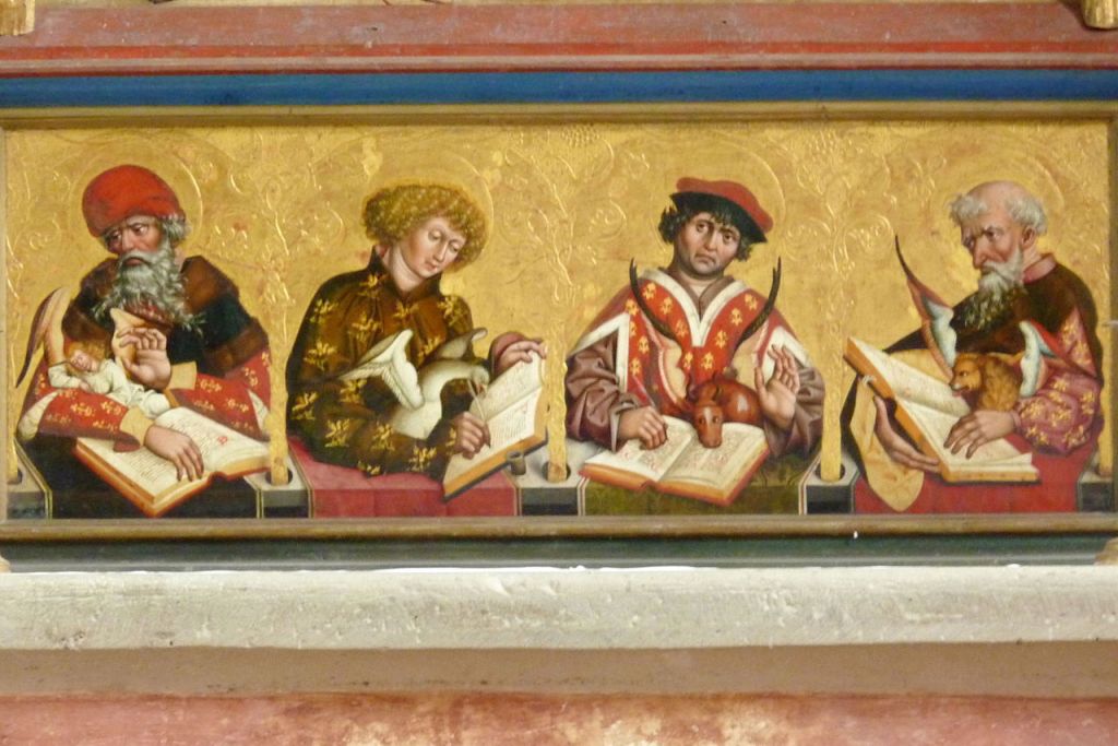Les évangélistes peuvent être représentés sous leur forme humaine en train d’écrire leurs Evangiles. Pour être reconnus ils sont toujours accompagnés de leur image symbolique. Celle-ci peut paraître sous une forme figurative seule – le Tétramorphe (du grec tetra : 4 et morphe : forme) : l’homme, le lion, le taureau et l’aigle. Ces 4 figures sont toujours ailées.