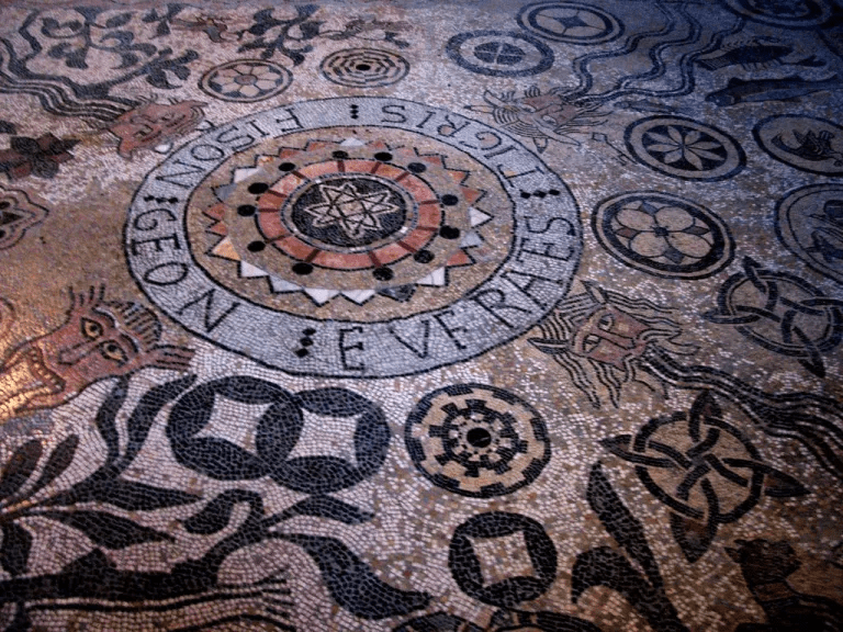 Elle représente les quatre fleuves qui abreuveraient le jardin d’Éden mentionnés dans la Bible, dans le deuxième chapitre de la Genèse (Gn 2,11 & 12). Ceux-ci sont figurés partant du motif central circulaire et dirigés vers les angles de la mosaïque. Ils sont nommés dans un cartouche circulaire, avec une orthographe approximative : Geon (le Gihon dans la Bible), Fison (le Pishon dans la Bible), Tigris (le Tigre), Eufrates (l’Euphrate).