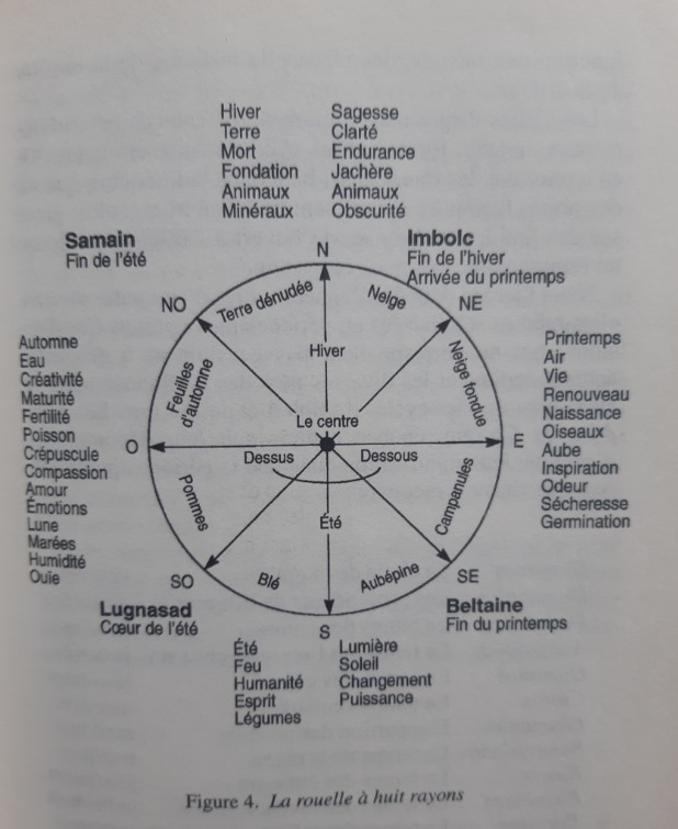 Puis, une fois prêt, prenez le pierres qui représentent représenteront les quatre grandes fêtes celtiques : Imbolc, Beltaine, Lugnasad et Samain. Observez ce qu’elles signifient pour vous, leurs résonances mythiques; elles peuvent aussi être considérées comme les quatre âges de l’être humain :Imbolc = l’enfance; Beltaine = la jeunesse; Lugnasad = l’âge adulte; Samain = la vieillesse