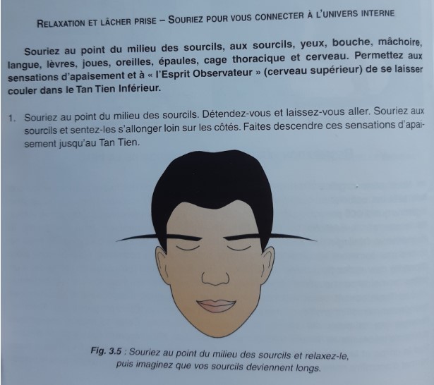 Souriez au point du milieu des sourcils, aux sourcils, yeux, bouche, mâchoire, langue, lèvres, joues, oreilles, épaules, cage thoracique et cerveau. Permettez aux sensations d’apaisement et à l’ « Esprit Observateur » (cerveau supérieur) de se laisser couler ans le Tan Tien inférieur (chaudron d’énergie vitale situé dans le bas -ventre).